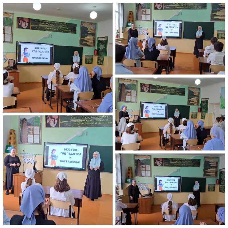 04.05.2023В рамках реализации плана мероприятий к Году педагога и наставника в МБОУ " ООШ п.Чири-Юрт" 4 мая 2023 года проведена творческая встреча с педагогом наставником "КЛАССные истории". Педагог-наставник Болтиева Зарема Султановна рассказала учащимся 9 класса о своей профессии, о работе, об учениках, об интересных историях из школьной жизни. Дети с интересом слушали педагога, задавали вопросы и получали ответы.
