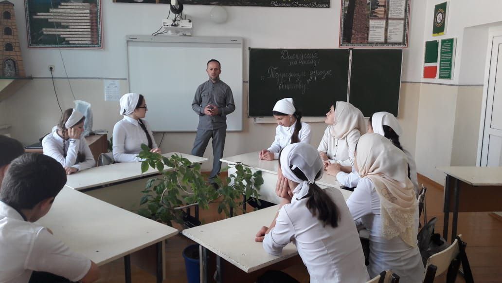 Терроризм-угроза обществу! 28.11.22г. В МБОУ " ООШп.Чири-Юрт " педагог по духовно-нравственному воспитанию Камайлаев У.Р. провёл дискуссию с учащимися на тему: " Терроризм угроза обществу !".