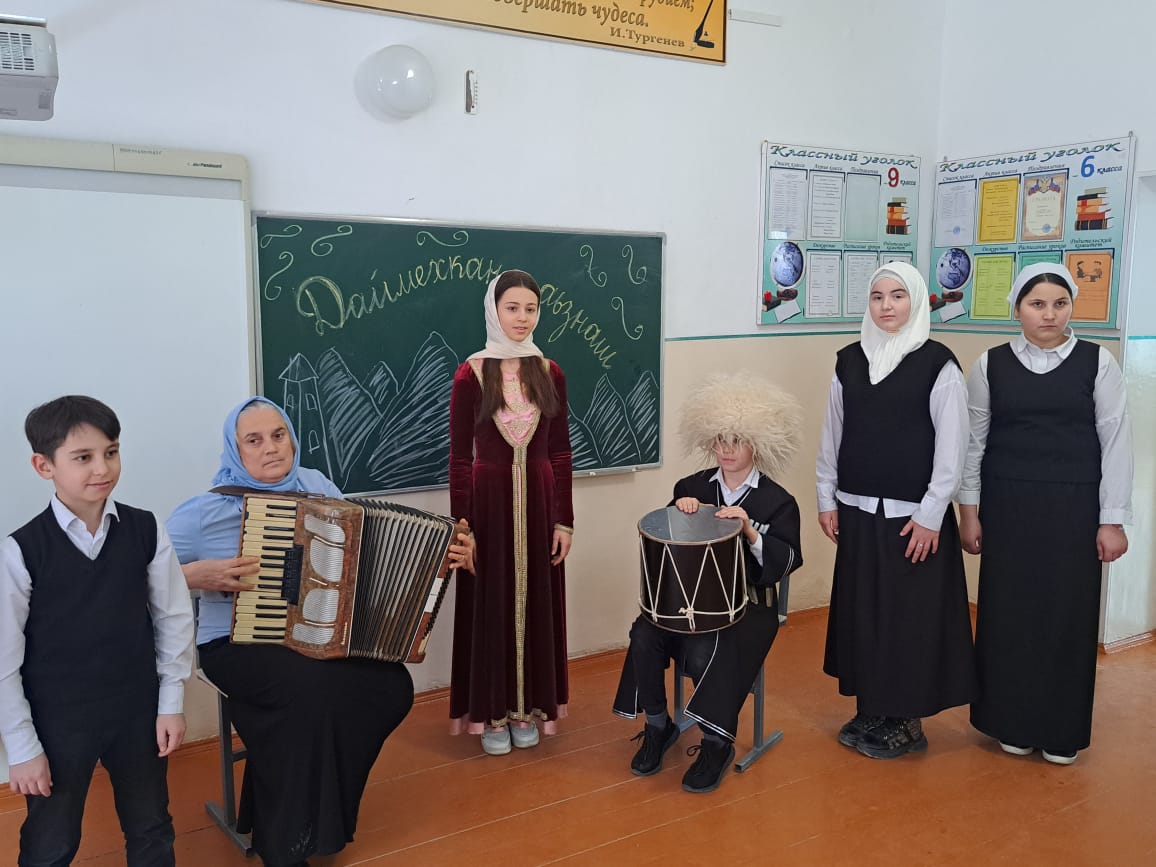 в МБОУ "ООШ п.Чири-Юрт" учителем музыки Мамацаевой П.С. проведена литературно-музыкальная композиция "Даймехкан аьзнаш" среди учащихся 5-6 классов. Школьники исполнили чеченские народные песни и танцы.