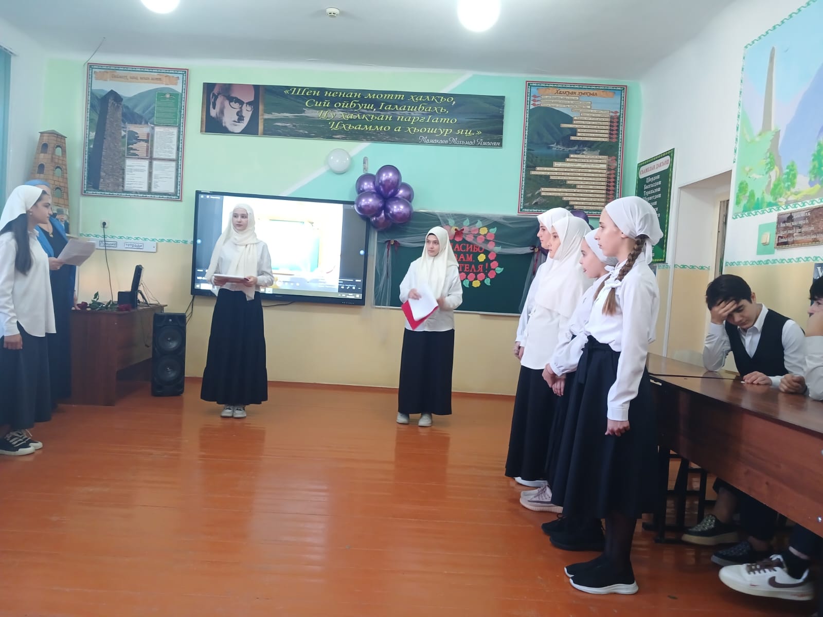 04.10.2024г.в МБОУ"ООШс.Чири-Юрт Шалинского муниципального района " состоялось общешкольное мероприятие, посвящённое "Дню учителя ". На мероприятии принимали участие директор школы Юсупова С.Р.,заместители директора, учителя и учащиеся школы. По словам заместителя директора по воспитательной работе Исраиловой З.М., праздник " День учителя " отмечается каждый год 5 октября, проводятся праздничные мероприятия, посвящённые этому дню, поздравляют учителей , дарят им цветы.