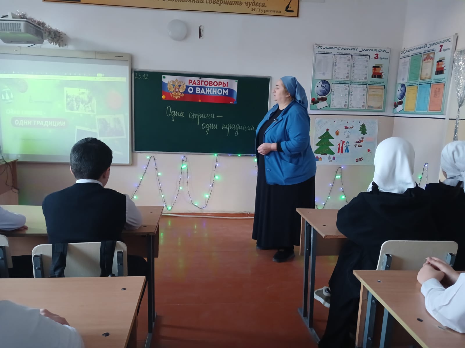 23 декабря 2024 года в МБОУ "ООШ с.Чири-Юрт Шалинского муниципального района " прошло внеурочное занятие " Разговоры о важном" на тему " Одна страна - одни традиции" .