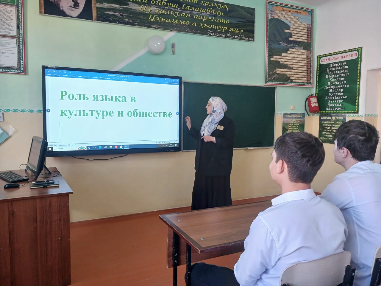 22 апреля 2025 года в МБОУ "ООШ с.Чири-Юрт Шалинского муниципального района " учитель чеченского языка и литературы Ханалиева З.С. провела для учащихся 5-9 классов серию открытых лекций на тему " Роль языка в культуре и обществе ".