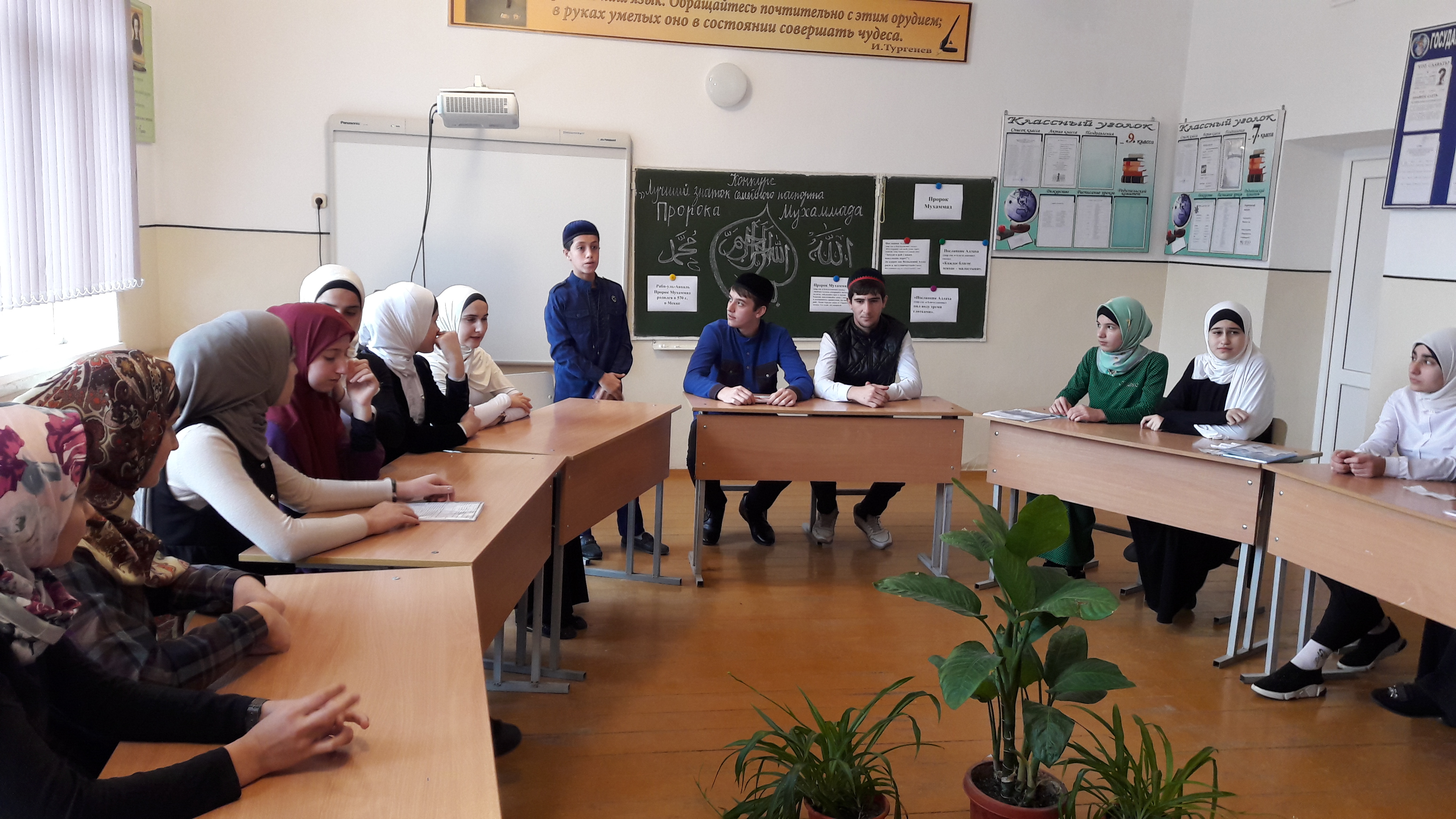 Учащимся была предоставлена возможность задать интересующие их вопросы. В завершение своего выступления Камайлаев У.Р., добавил, что в Исламе ученик не только должен чтить своего учителя так же, как и своих родителей, но в большинстве случаев проявлять наибольшее уважение. С большим вниманием слушали учащиеся наставления и нравоучения педагога – организатора по ДНВ Камайлаева У.Р. Мероприятие прошло интересно. В завершении мероприятии было совершено Чтение Мовлида.